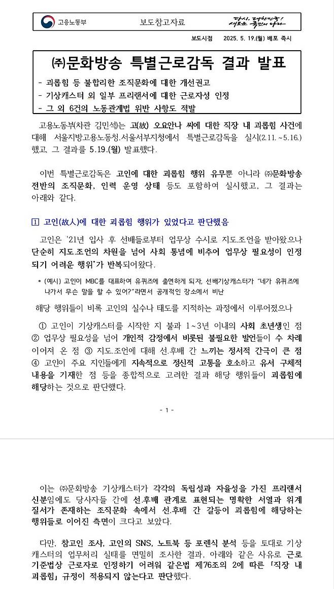 | ▲ 지난 5월 19일 MBC를 대상으로 고용노동부에서 실시한 특별근로감독 결과에 대한 보도자료 |