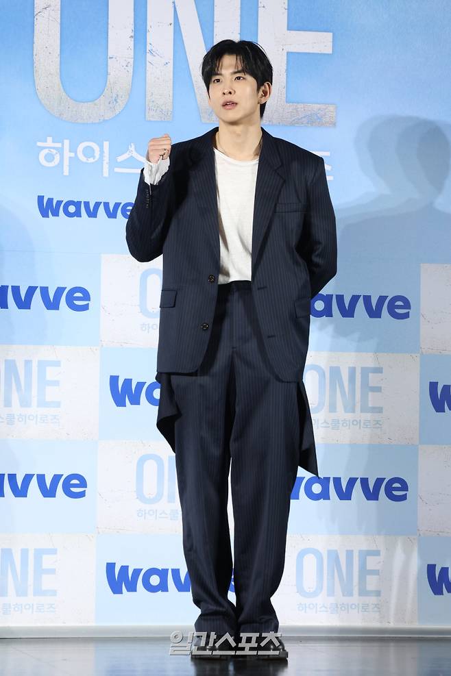 배우 임성균이 28일 오전 서울 광진구 롯데시네마 건대입구점에서 열린 웨이브 오리지널 'ONE : 하이스쿨 히어로즈' 제작발표회에 참석해 포즈를 취하고 있다.