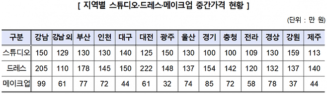 결혼식장 외에 스튜디오, 드레스, 메이크업 등 이른바 '스드메' 비용도 지역별 편차가 컸다. 스튜디오(20P 앨범, 20R 액자 기준)는 평균 135만원이다. 지역별로는 강원도가 159만원으로 가장 높고 경기도와 충청도가 100만원으로 가장 낮았다. 드레스(본식 1벌+촬영 3벌)는 평균 155만원으로 대전이 222만원, 서울(강남 외)이 110만원이었다. 메이크업(본식+촬영)은 평균 76만원으로, 서울 강남이 99만원으로 가장 비쌌다. 광주가 32만원으로 가장 저렴했다.