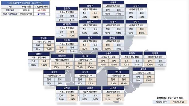 | ▲ 2024년 10월 서울시 평균 대비 자치구별 전월세 시세 2024년 10월 서울시 평균 대비 자치구별 전월세 시세를 보여주는 그림 |