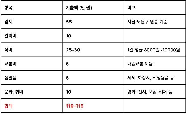 | ▲ 대학생 A 씨의 한 달 지출 내역 월세 55만 원, 관리비 10만 원, 식비 25-30만 원, 교통비 5만 원, 생필품 5만 원, 문화취미 10만 원 |