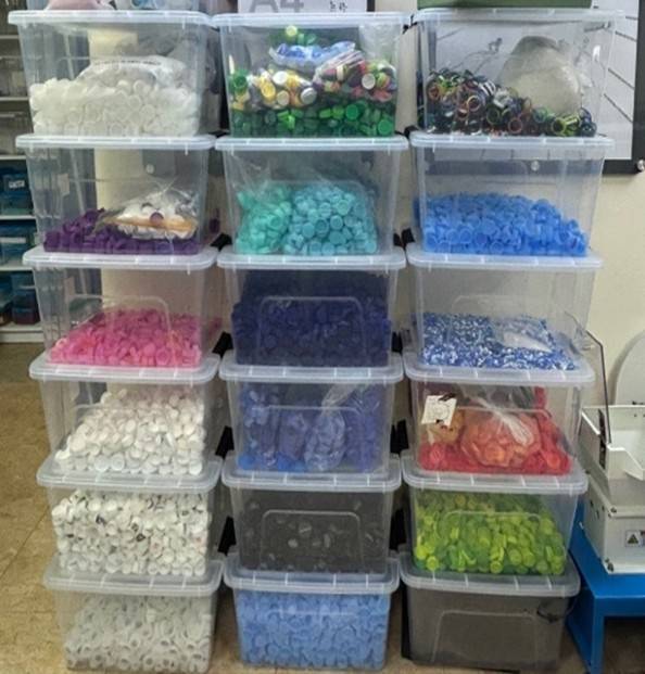 | ▲ 색깔별로 분류된 병뚜껑 |