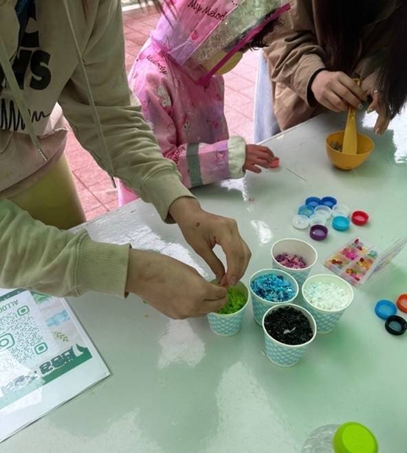 이후 정리된 병뚜껑은 플라스틱 업사이클링 전문 기업 '알록'에 전달되었다. 알록은 Precious Plastic 플라스크 머신을 이용해 병뚜껑을 분쇄하고, 이를 색감 있는 플라스틱 조각으로 가공하였다. 이 조각들은 이후 업사이클링을 통한 표현의 재료로 쓰도록 했다. 하나의 작품 재료가 된 셈이다.