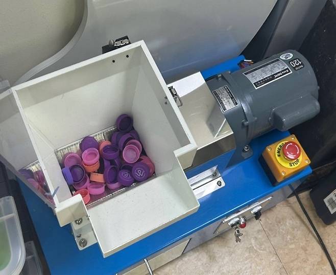 | ▲ 플라스틱 업사이클링 업체 ‘알록’ 에 방문해 분쇄 중인 병뚜껑 |