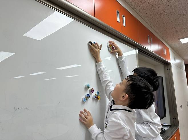 '바다 자석 만들기' 활동은 교육의 연장선에서 진행됐다. 병뚜껑 한쪽에는 레진과 모래를 섞어 모래사장을 표현하고 다른 쪽에는 분해된 플라스크 조각을 활용해 바다를 구성했다. 여기에 거북이, 조개, 물고기 등 다양한 해양 생물 파츠를 더한 뒤 레진으로 고정하고 UV 램프로 경화하는 방식으로 자석을 완성했다.