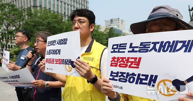 민주노총은 '헌법이 보장하는 참정권은 모든 국민의 권리임에도 현실에서 수많은 노동자가 고용형태, 사업장 규모, 근무조건 등을 이유로 투표권을 제대로 행사하지 못하고 있다. 특히 택배, 건설, 돌봄, 서비스, 5인미만 사업장 등 열악한 노동환경에 놓인 노동자들은 선거일에 정상근무를 강요받고 있다"며 모든 노동자의 실질적 참정권 보장을 위한 제도개선과 행정적 대책 마련을 촉구했다. 2025.05.28. chocrystal@newsis.com