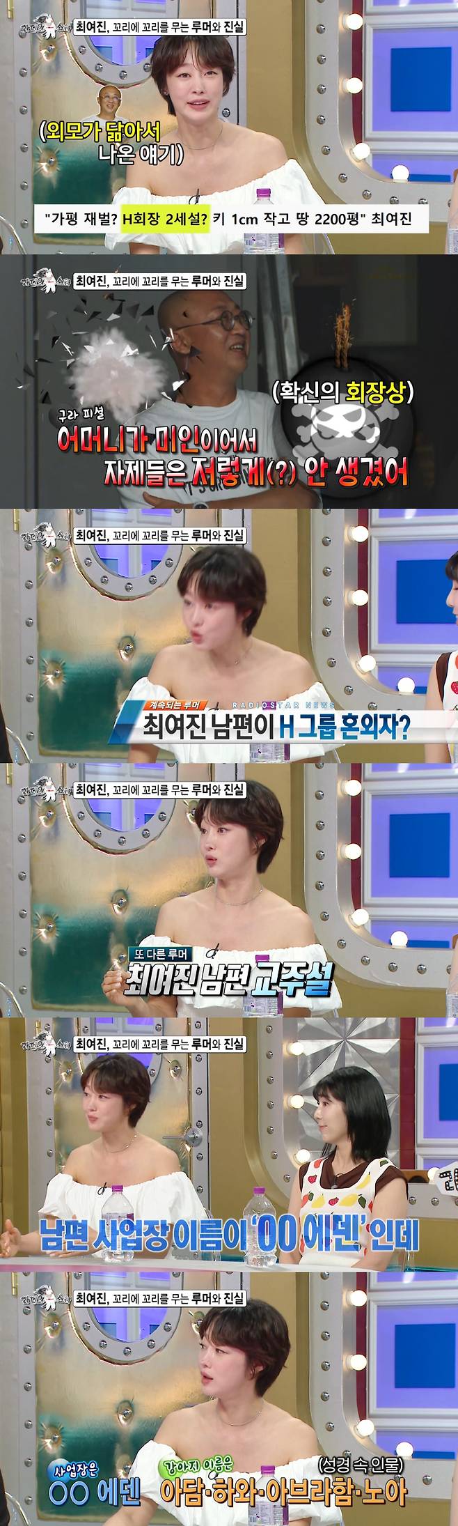 이를 들은 이경실은 "남편이 종교가 있긴 있냐"고 물었고, 최여진은 "기독교다. 그래서 'XX에덴'이라는 이름을 짓고, 반려견 이름도 (성경 속 인물인) 아담, 하와, 아브라함, 노아다. (남편은)동네 교회 다니면서 피아노 배운다"고 설명했다. 이어 "사실 너무 어이없는 이야기라서 그냥 박장대소하면서 웃고 넘어갔는데 일이 점점 커지고 눈덩이처럼 불어나더라"고 토로했다.