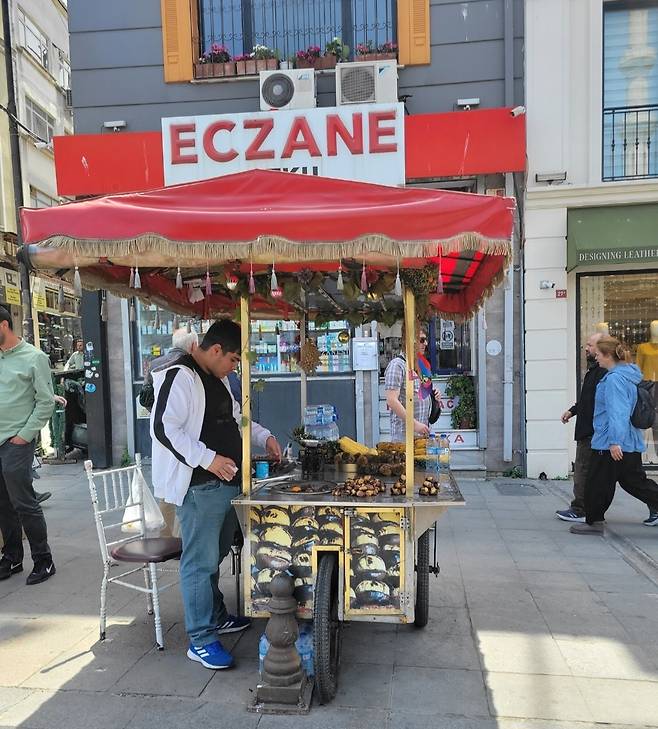 그런데 이번에는 뜻밖에도 이스탄불에서 군밤장수를 만났다. 그것도 겨울이 아닌 5월의 따뜻한 봄날, 인파가 북적이는 시장가 인도 한복판에서였다. 그 장면을 본 순간, 내 머릿속 고정관념이 한꺼번에 두 가지나 깨졌다. 군밤장수가 한국과 이탈리아에만 있는 것이 아니었고, 겨울에만 등장하는 존재도 아니었던 것이다. 길거리에 군밤 냄새가 풍기는 그 풍경은, 무척 이질적이면서도 동시에 익숙했다.