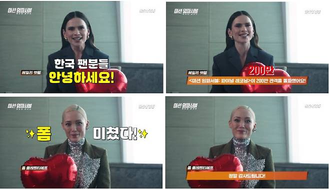 ‘미션 임파서블: 파이널 레코닝’은 인류 전체를 위협하는 절체절명의 위기 속에 내몰린 ‘에단 헌트’(톰 크루즈 분)와 IMF 팀원들이 목숨을 걸고 모든 선택이 향하는 단 하나의 미션에 뛰어드는 액션 블록버스터다. 전 세대 관객들의 뜨거운 입소문에 힘입어 멈추지 않는 흥행 질주를 이어가고 있는 영화 ‘미션 임파서블: 파이널 레코닝’이 개봉 12일째인 28일(수) 200만 관객을 돌파했다. 이는 올해 최고 관객수를 기록 중인 영화 ‘야당’의 17일째 200만 돌파보다 5일 빠른 속도로, ‘미션 임파서블: 파이널 레코닝’이 극장가 최고의 흥행 강자임을 입증한다. 또한 ‘미션 임파서블: 파이널 레코닝’은 개봉 이후 11일 연속 압도적 박스오피스 1위를 유지하며 흥행 독주를 이어가고 있다. 한편, 극 중 새로운 활약을 선보인 두 인물 ‘그레이스’ 역의 헤일리 앳웰과 ‘파리’ 역의 폼 클레멘티에프가 200만 관객 돌파 소식에 대한 감사 인사를 전했다. 헤일리 앳웰은 “한국 팬분들 안녕하세요!”라고 밝은 미소로 인사를 전한 뒤, “‘미션 임파서블: 파이널 레코닝’이 200만 관객을 돌파했어요!”라며 관객들의 뜨거운 관람 열기에 기쁜 마음을 드러냈다. 이어 폼 클레멘티에프는 “폼 미쳤다”라며 자신의 이름을 활용한 한국 유행어로 재치 있는 인사를 전해 팬들의 반가움을 자아낸다.