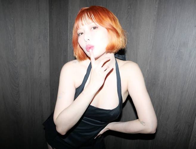공개된 사진 속 현아는 밝은 오렌지 컬러의 단발 헤어스타일로 시크하면서도 발랄한 분위기를 자아냈다. 어두운 조명의 실내에서 카메라 플래시를 정면으로 받은 그녀는 깊게 파인 블랙 민소매 의상과 그물 스타킹, 워커를 매치해 과감한 룩을 완성했다.
