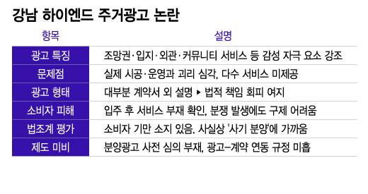 서울 강남권 주거시장에서 '하이엔드'를 내세운 신축 건물이 설계·광고와는 다른 모습으로 지어져 입주자들을 당황케 하는 사례가 늘고 있다. 분양 당시 약속한 커뮤니티 시설을 갖추지 않아 법적 분쟁이 진행중인 곳도 있다.