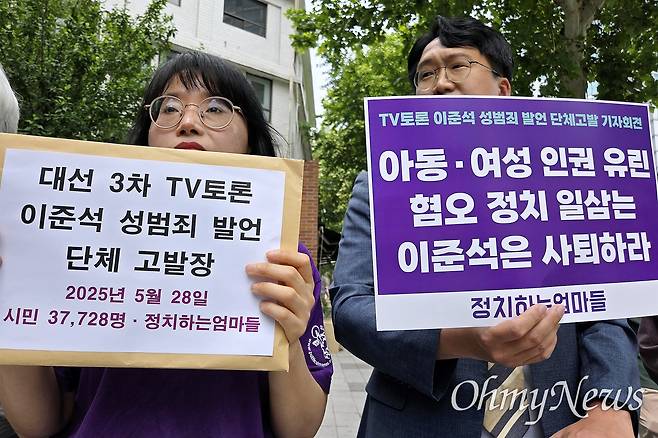 시민단체 '정치하는엄마들'은 28일 오후 1시 서울 서대문구 경찰청 앞에서 기자회견을 열어 "3차 TV토론에서 이 후보의 성범죄 발언은 전 국민에 대한 모독이자 토론을 시청한 아동, 청소년들 향한 정서적 아동학대"라고 발표한 뒤 고발장을 제출했다. 정치하는엄마들은 TV토론 직후인 자정부터 고발인을 모집했고 12시간 만에 3만 7728명이 참여했다.