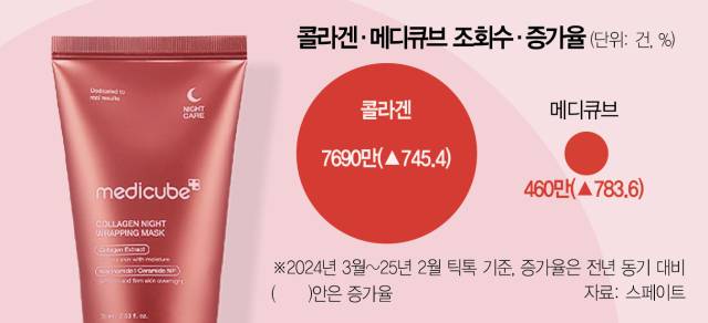 소비자들이 ‘메디큐브 콜라겐 마스크’ ‘메디큐브 콜라겐 젤리 크림' 등을 검색하면서 메디큐브 콜라겐 나이트 랩핑 마스크는 현재 아마존 페이셜마스크 부문에서 판매량 2위에, 페이셜 스킨케어 부문에서도 10위에 오른 상태다. ‘메디큐브 PDRN 핑크 콜라겐 겔 마스크’ 역시 페이셜마스크 부문 3위를 차지하고 있다. 한 뷰티업계 관계자는 “클린뷰티 트렌드가 전세계에서 확산되면서 성분에 관심을 두는 소비자들이 늘어나고 있다”며 “K뷰티는 단순히 예쁜 패키징 등을 넘어 효능을 앞세우고 있는데 이 같은 전략이 글로벌 시장에서 통하는 것으로 볼 수 있다”고 말했다.