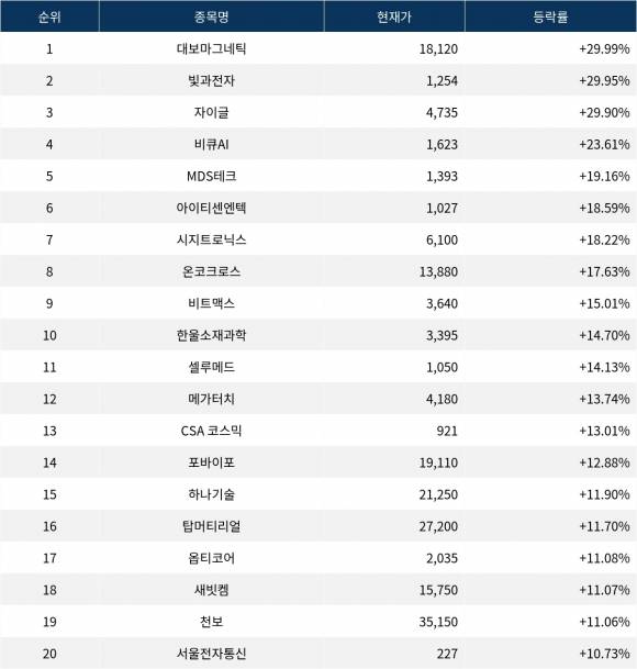 6위 아이티센엔텍(010280)은 종가 1,027원으로 18.59% 상승 마감했다. 7위 시지트로닉스(429270)는 종가 6,100원으로 18.22% 상승 마감했다. 8위 온코크로스(382150)는 종가 13,880원으로 17.63% 상승 마감했다. 9위 비트맥스(377030)는 종가 3,640원으로 15.01% 상승 마감했다. 10위 한울소재과학(091440)은 종가 3,395원으로 14.70% 상승 마감했다.