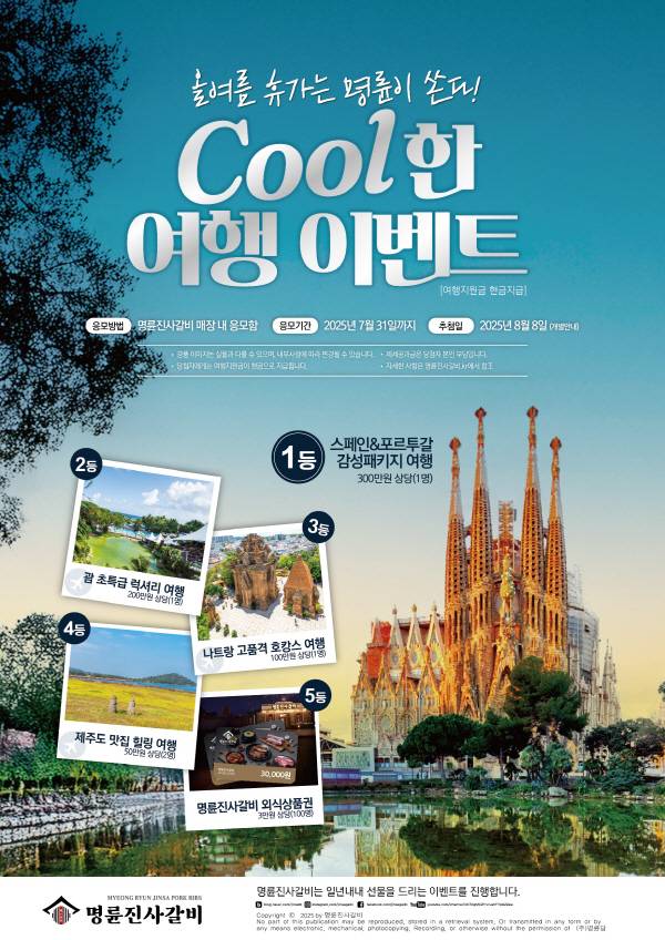 이벤트 경품으로는 △1등 스페인 & 포르투갈 감성 패키지 여행(300만 원 현금 지급) 1명, △2등 괌 초특급 럭셔리 여행(200만 원 현금 지급) 1명, △3등 나트랑 고품격 호캉스 여행(100만 원 현금 지급) 1명, △4등 제주도 맛집 힐링 여행(50만 원 현금 지급) 2명, △5등 명륜진사갈비 외식상품권(3만 원권) 100명에게 지급된다.
