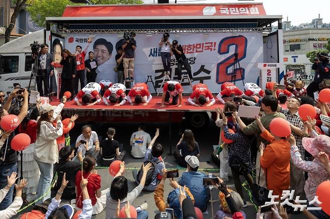 김문수 국민의힘 대선 후보가 28일 오후 경남 양산시 이마트 양산점 앞에서 열린 필승으로 이어질, 양산의 함성 유세에서 시민들에게 지지를 호소하며 큰절을 하고 있다.