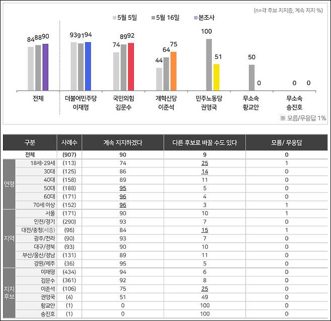 또, 전체의 90% 응답자는 '지금 지지하고 있는 후보를 계속 지지하겠다'고 답했는데, 후보별로는 이재명 후보 지지층은 94%, 김문수 후보 지지층은 92%, 이준석 후보 지지층은 75%가 '계속 지지하겠다'고 했습니다.