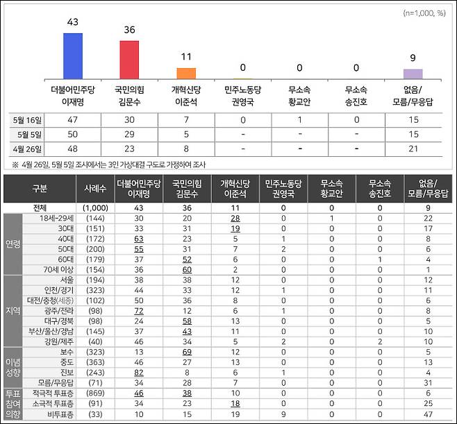 - [여론조사] 이재명 43%·김문수 36%·이준석 11%‥지지층 결집 강화