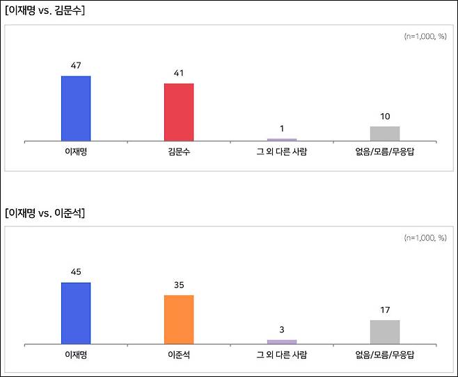 이재명 후보와 김문수 후보, 이재명 후보와 이준석 후보가 각각 양자 대결을 하게 되면 어느 후보에게 표를 주겠냐는 질문에는, 이재명-김문수 후보가 맞붙을 경우 지지도가 각각 47%와 41%, 이재명-이준석 후보가 맞붙을 경우 각각 45%와 35%로 나타났습니다.