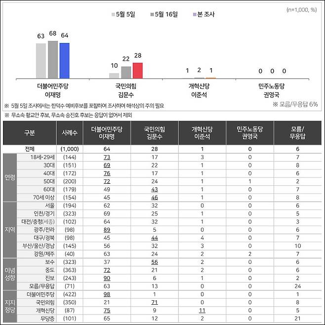 당선 가능성에선 이재명 64%, 김문수 28%, 이준석 1% 순이었고, 정당 지지도에선 더불어민주당 42%, 국민의힘 35%, 개혁신당 9% 순이었습니다.