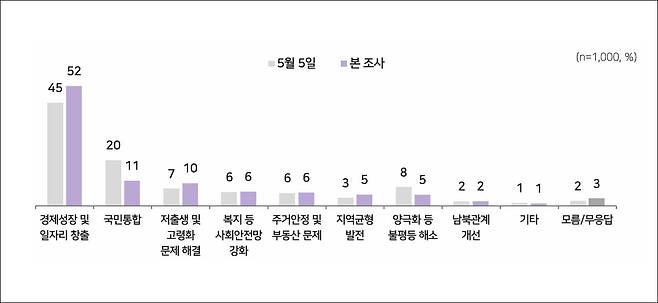 대선 후보들이 가장 집중해야 하는 정책으로는 절반 넘는 52%의 응답자가 '경제 성장과 일자리 창출'을 꼽았고, '국민 통합', '저출생·고령화 문제 해결' 순으로 뒤를 이었습니다.