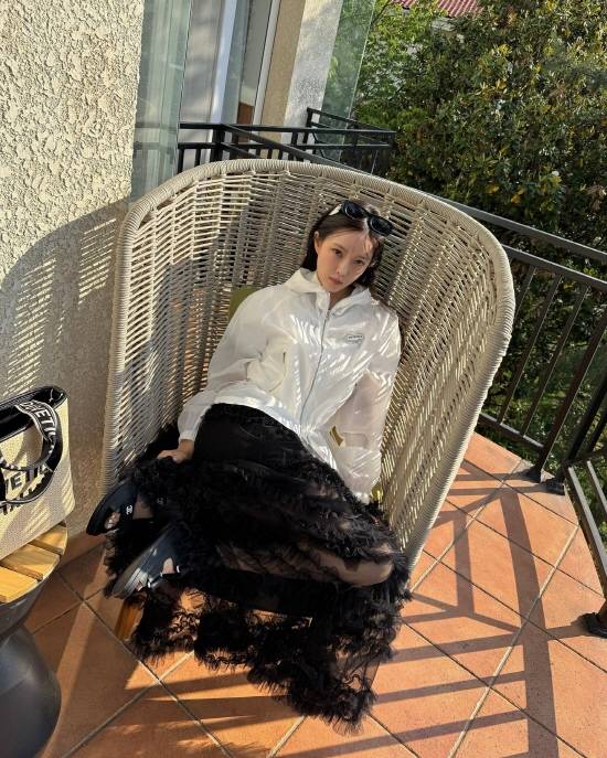 화이트 셔링 점퍼는 허리 스트링으로 실루엣을 강조하며 단정하면서도 여성스러운 분위기를 연출했다. 여기에 레이어드된 블랙 시스루 러플 스커트는 풍성한 텍스처감과 함께 가벼운 움직임을 더해, 마치 드레스를 연상하게 하는 고급스러움을 자아냈다.