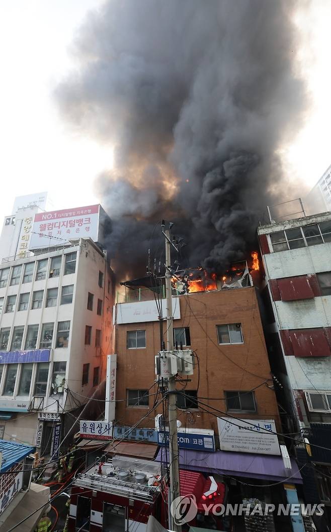 (서울=연합뉴스) 이진욱 기자 = 28일 서울 을지로3가역 인근 건물에서 화재가 발생해 불길과 함께 검은 연기가 피어오르고 있다. 2025.5.28