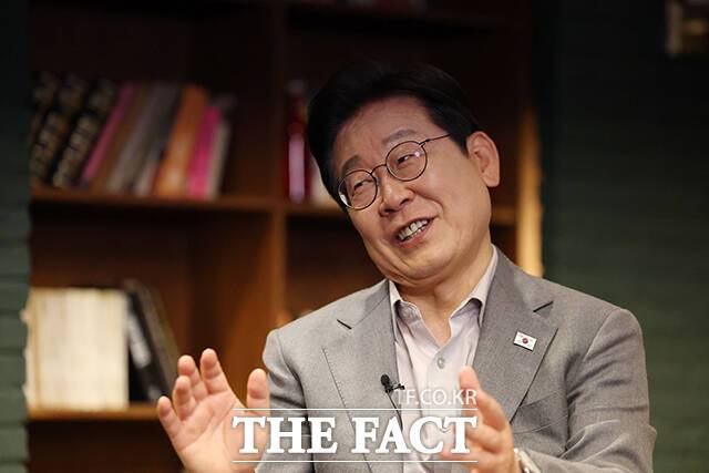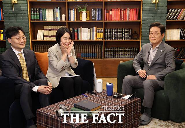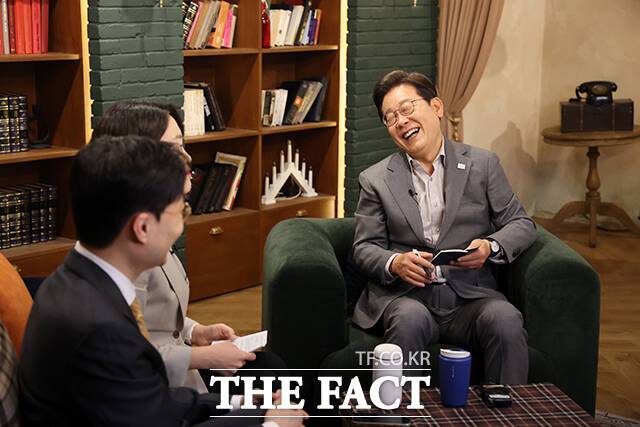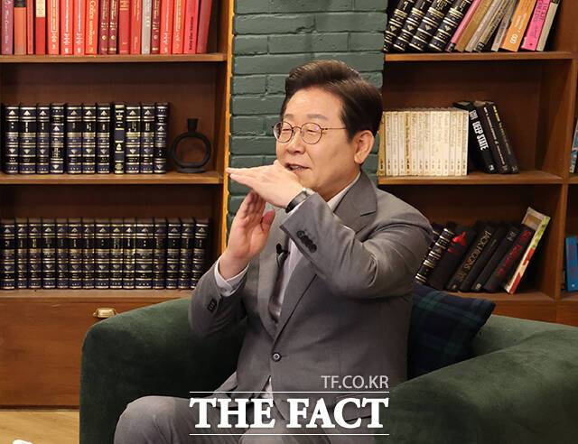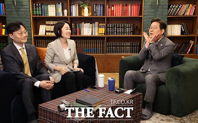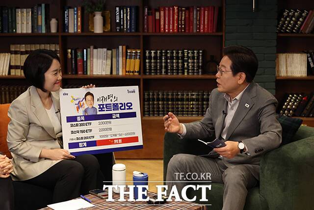 [더팩트ㅣ배정한 기자] 이재명 더불어민주당 대선후보가 28일 오후 서울 강남구 미드타운 스튜디오에 열린 '1400만 개미와 한배 탔어요' 유튜브 라이브에 출연해 발언하고 있다.