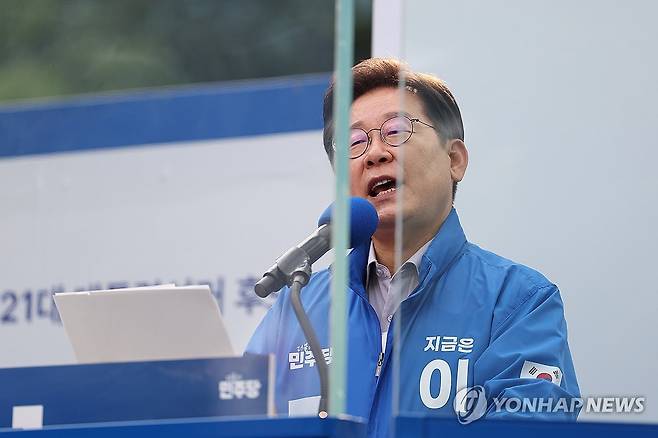 (서울=연합뉴스) 황광모 기자 = 더불어민주당 이재명 대선 후보가 28일 서울 광진구 어린이대공원 정문 앞에서 열린 광진구·중랑구 집중 유세에서 지지를 호소하고 있다. 2025.5.28