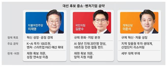 28일 벤처·스타트업 업계에 따르면 후보들은 AI 진흥을 내세웠다. 이재명 더불어민주당 후보는 33개 분야에서 정책 공약을 내놨는데, 이 중 하나가 세계 3대 AI 강국을 만들겠다는 'K-AI 이니셔티브 전략'이다. AI 투자 100조원, 고성능 그래픽처리장치(GPU) 최소 5만개 확보부터 생성형 AI 무료 사용을 추진하는 내용이 담겼다. 이 후보는 "한국형 챗GPT를 전 국민이 사용하게 된다면 수많은 데이터가 쌓이고, 이것이 신산업 창출로 이어져 국가 경쟁력을 강화할 것"이라고 강조했다.