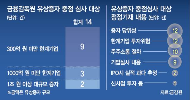 금융감독원이 중점심사 대상으로 선정한 유상증자 14건 중 12건이 한계기업의 자금 조달인 것으로 나타났다.