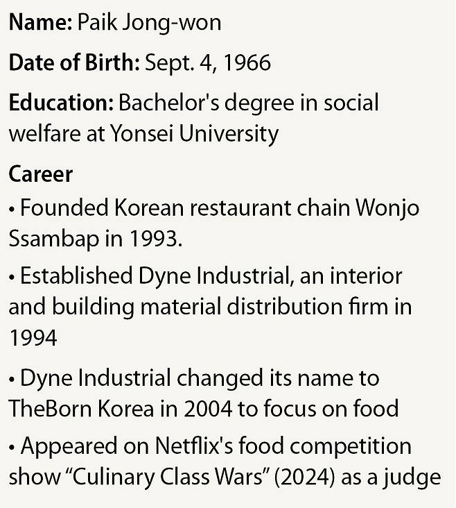 “Culinary Class Wars” judge Paik Jong-won might be one of the most well-known chefs in Korea, but his fame is not rooted in Michelin-starred finesse or a fiery temper like Gordon Ramsay. Dubbed “Paik Jubu” by the public — a blend of his name and the Korean word for homemaker — the 58-year-old man earned the nickname for his relatable charm, fuss-free cooking tutorials and business acumen.