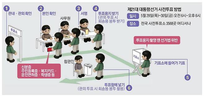 28일 중앙선거관리위원회에 따르면 사전투표는 전국 3568개 투표소에서 치러진다. 사전투표는 주소지와 관계없이 전국 어디에서나 가능하다. 다만 주민등록증, 여권, 운전면허증 등 신분증을 꼭 지참해야 한다. 모바일 신분증도 허용되지만 화면 캡처를 통해 저장한 이미지는 인정되지 않는다.