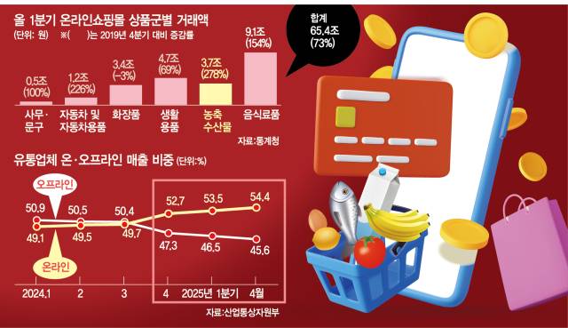 28일 통계청에 따르면 올해 1분기 온라인쇼핑몰에서 판매된 농축수산물 거래액은 3조 7055억 원으로 전년 동기(3조 3429억 원) 대비 10.8% 증가했다. 코로나19 팬데믹 직전인 2019년 4분기(9801억 원)에 비해서는 3.8배 급증했다. 같은 기간 온라인쇼핑몰 전체 상품군 거래액이 37조 8434억 원에서 65조 4271억 원으로 73% 증가에 그쳤으며, 화장품 온라인 거래액은 오히려 3% 감소했다. 지난 5년여 동안 온라인에서 농축수산물 거래 증가세가 두드러진 셈이다. 해당 상품군은 대부분 유통기한이 짧은 신선식품에 해당한다.