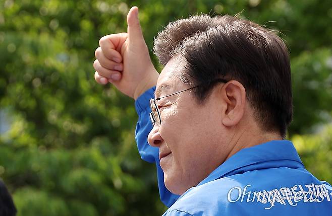 | ▲ 이재명 더불어민주당 대선 후보가 26일 오후 경기 용인시 단국대 죽전캠퍼스 정문 앞에서 지지를 호소하고 있다. |