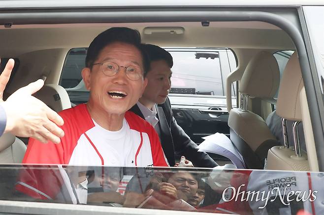 | ▲ 김문수 국민의힘 대선 후보가 28일 경남 양산시 이마트 양산점 앞에서 유세를 마치고 떠나며 지지자들에게 인사하고 있다. |