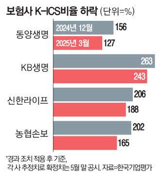 기준금리 인하 기조가 이어지며 보험사들의 재무건전성에 '경고등'이 켜졌다. 손실 대응 능력을 뜻하는 지급여력(K-ICS·킥스)비율이 대거 하락하면서 신용평가업계는 보험사 신용도에 대한 모니터링을 강화하고 있다.