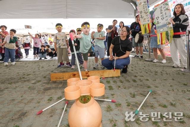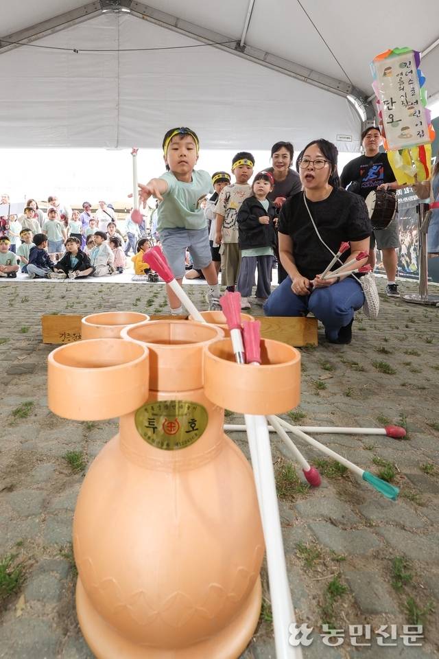 28일 강릉단오장 투호체험장에서 유치원생들이 투호놀이를 하며 전통문화를 체험하고 있다.