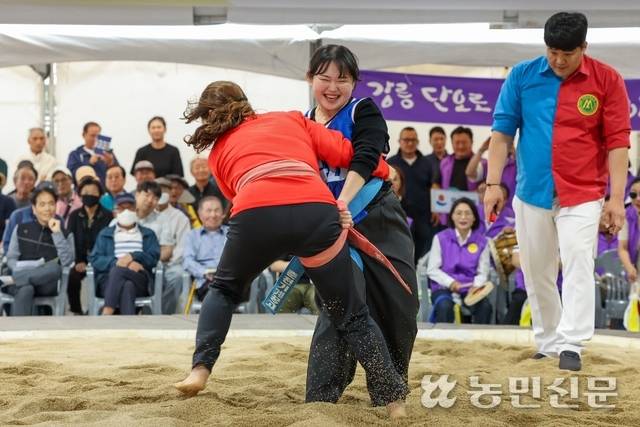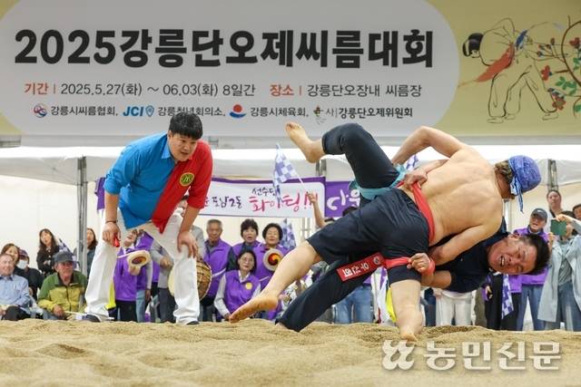 유네스코 인류무형문화유산 등재 20년을 맞은 ‘2025 강릉단오제’가 열린 강릉단오장 씨름장에서 28일 씨름대회’가 열리고 있다.