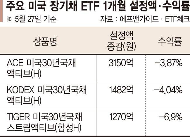최근 한 달 새 설정액이 눈에 띄게 늘어난 북미 채권펀드에는 미국 장기채 상장지수펀드(ETF)가 나란히 이름을 올렸다. ACE 미국30년국채액티브(H)에는 최근 한 달 사이 3150억원이 유입됐다. 뒤이어 KODEX 미국30년국채액티브(H) 1482억원, TIGER 미국30년국채스트립액티브(합성H) 1270억원, RISE 미국30년국채엔화노출(합성H) 1140억원 순이다. 다만 이들 상품 수익률은 우하향 곡선을 벗어나지 못하고 있다. 최근 한 달 개인 투자자 순매수세가 가장 몰린 미국 장기채 ETF인 ACE 미국30년국채액티브(H)는 지난 22일 7450원에 거래를 마치며 52주 신저가를 기록했다. 이날은 7575원에서 거래를 마쳤지만 여전히 최근 한 달 수익률은 -3.87%에 이른다. 마찬가지로 TIGER 미국30년국채스트립액티브(합성H)와 KODEX 미국30년국채액티브(H)의 한 달 하락률도 각각 -6.9%, -4.04%에 달한다.
