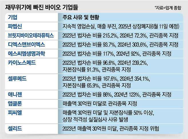 실제로 최근 핵심 파이프라인 임상시험에서 유효성 증명에 실패한 브릿지바이오테라퓨틱스를 비롯해 디엑스앤브이엑스, 에스씨엠생명과학, 카이노스메드, 셀루메드 등 10곳이 넘는 기술특례 상장 바이오·헬스케어 기업이 법차손 기준 미달로 관리종목에 지정됐다.