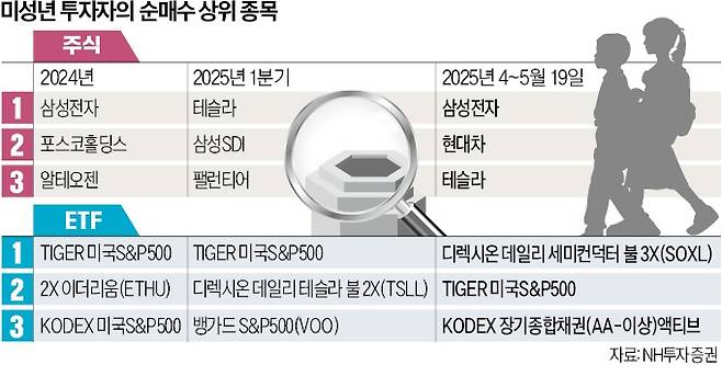 테슬라는 전기차 시장과 관련한 부정적인 전망 때문에 주가가 지난 1~3월 35% 급락하며 선호도가 떨어졌다. 테슬라 주식 순매수 금액은 올해 1~3월 46억8000만원에 달해 2024년 1위이던 삼성전자를 꺾고 이 기간 ‘부모가 자녀에게 가장 많이 선물한 주식’ 자리를 차지했다.