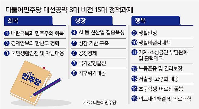 더불어민주당은 사전투표를 하루 앞둔 28일 ‘이제부터 진짜 대한민국’이라는 이름의 정책 공약집을 발표했다. 내란 극복과 사법개혁·성장·민생 등 그간 이재명 대선후보가 제시해온 정책을 집대성한 형태지만, 재원 마련 방안이 미흡하다는 지적도 나온다.