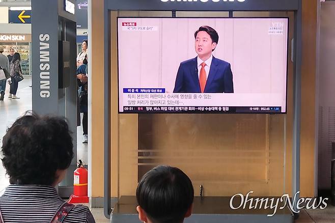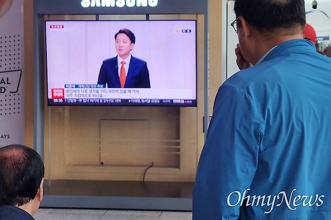 | ▲ 성폭력, 여성혐오 등의 비판이 쏟아지고 있는 이준석 개혁신당 대선 후보의 3차 TV토론 발언 다음날인 28일 오전, 서울역을 찾은 시민들이 TV 화면 속 이 후보를 바라보고 있다. |