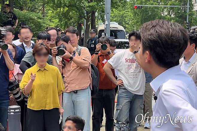 | ▲ 이준석 개혁신당 대선 후보가 28일 서울 영등포구 여의도공원에서 취재진과 질의응답을 하던 중, 한 시민이 전날 TV토론에서의 이 후보 발언을 강하게 비판하고 있다. |