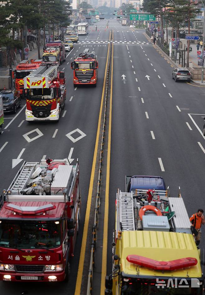 [서울=뉴시스] 홍효식 기자 = 28일 오후 서울 중구 을지로 세운대림상가 인근의 한 건물에서 화재가 발생해 을지로3~4가 도로가 통제되고 있다. 2025.05.28. yesphoto@newsis.com