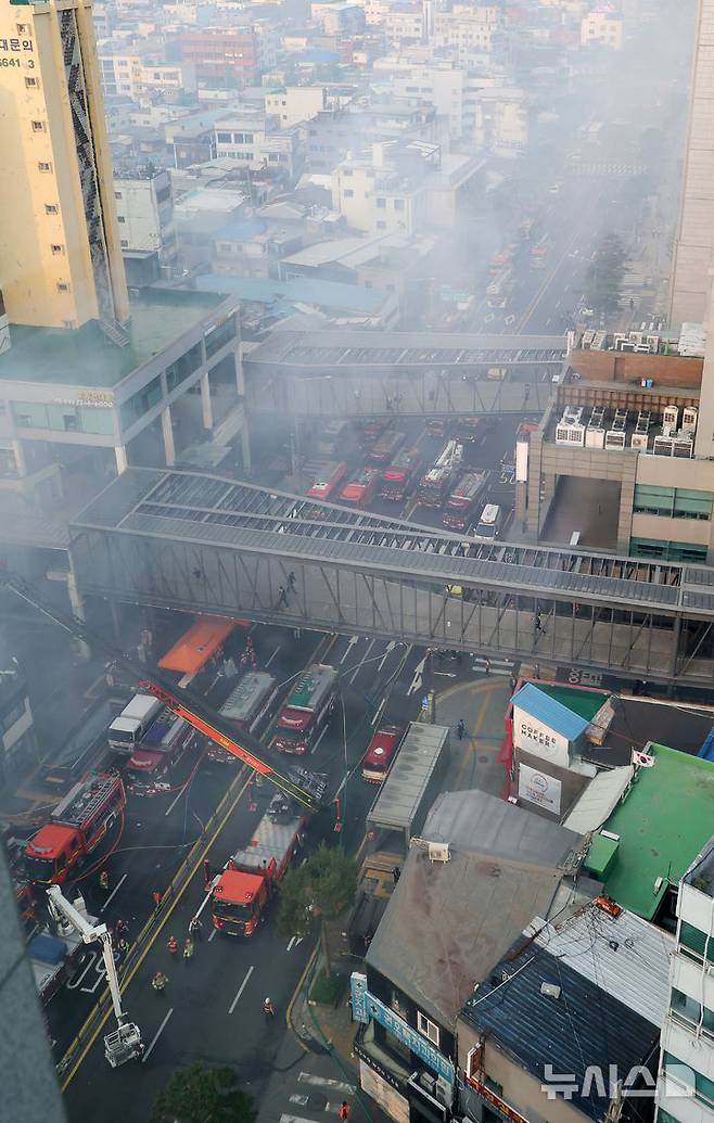 [서울=뉴시스] 홍효식 기자 = 28일 오후 서울 중구 을지로 세운대림상가 인근의 한 건물에서 화재가 발생해 을지로3~4가 도로가 통제되고 있다. 2025.05.28. yesphoto@newsis.com