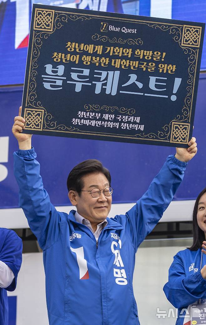 [서울=뉴시스] 조성우 기자 = 이재명 더불어민주당 대선후보가 28일 오후 서울 성동구 왕십리역 광장에서 열린 유세에서 청년의제 피켓을 들어 보이고 있다. (공동취재) 2025.05.28. photo@newsis.com