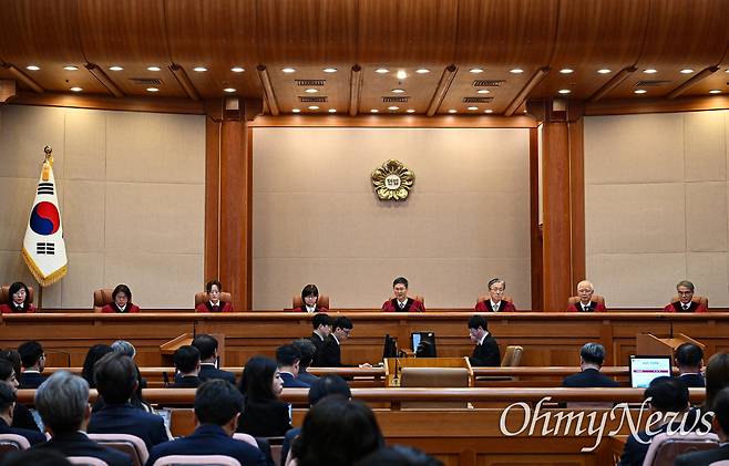 | ▲ 문형배 헌법재판소장 권한대행이 4월 4일 오전 서울 종로구 헌법재판소 대심판정에서 윤석열 대통령 탄핵심판 선고를 하고 있다. 탄핵심판이 인용되면서 윤석열 대통령은 11시 22분 파면되었다. |