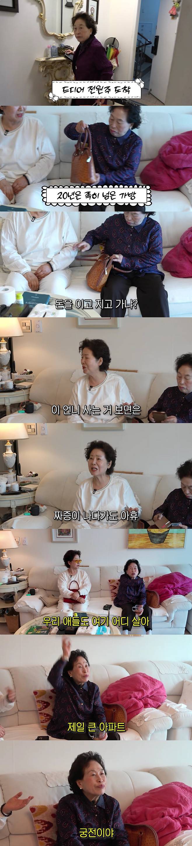 선우용여는 "이 언니 사는 거 보면 밉다가도 안타깝다. 그렇게 아끼는 게 좋은 건 아니다"라며 안쓰러워했고, 전원주의 낡은 휴대폰 케이스를 보고는 "언니 아들이 이런 거 바꿔주지도 않냐. 그렇게 살지 마라"라며 애정 섞인 잔소리를 쏟아냈다. 이에 전원주는 "테이프로 붙여 쓰면 되지 않냐"고 태연하게 받아쳤고, "우리 아들 여기 제일 큰 아파트 산다. 궁전이다"라며 너스레를 더했다.